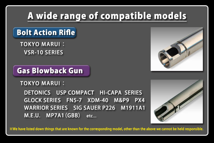 Tokyo Marui VSR-10 PX4、WARRIORseries、GLOCK18C、FN5-7、DETONCS、G17series、SIG P226、SOCOM、HI-CAPAseries(include EXTREME)、M1911、MEU、GLOCK26series、GLOCK26series...G HOP CHAMBER(after GLOCK26) ※Expect DESERT EAGLE |