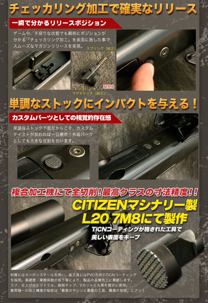 商品説明 純正のマグリリースボタンは間違えて押さないように、ストック面からマイナス設計で凹むようにセットされています。 本商品はそのボタンをあえて強調。しっかりと触れる事を想定し、チェッカリング加工が感覚的なマグリリースの操作を実現しました。 また、チェッカリング面は外観のアクセサリとしても主張。 市場に少ないパーツだけにインパクトは絶大です。